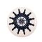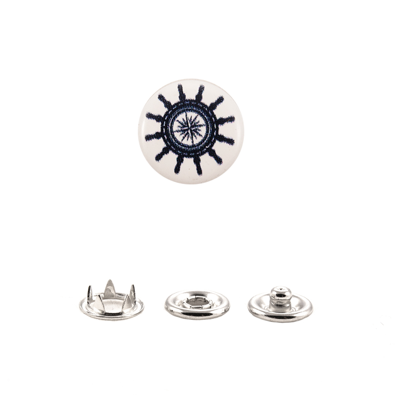 Какой дизайн Эмалевая шляпка с принтом «Штурвал». Другие детали кнопки выполнены в серебристом цвете.