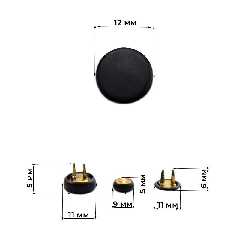 Кнопка может использоваться для обычной и двухсторонней одежды, так как имеет две шляпки: верхняя — 12 мм; нижняя — 11 мм.