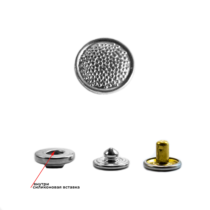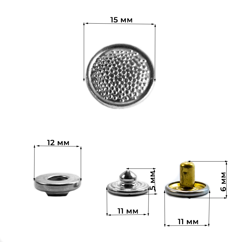 Две шляпки: верхняя — 15 мм; нижняя — 11 мм. Кнопка может использоваться для обычной и двухсторонней одежды.